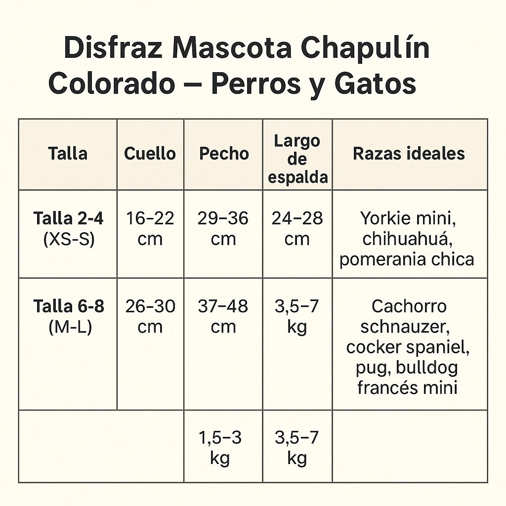 Mide cuello, pecho y largo y compáralo con la tabla. Si dudas, elige la mayor.